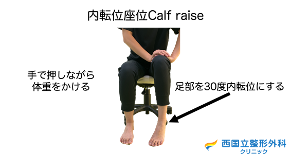 Calf raiseでふくらはぎを鍛えるためには足を30度内転位にした状態で行うと、筋活動が高まるという報告があるため、その肢位で行うことが有効です。